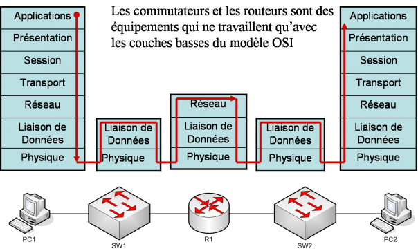 Chaque équipement réseau (PC, switch, routeur,…) a ses propres caractéristiques et donc a besoin de toutes les couches du modèles OSI ou seulement d’une partie.Dans ce schéma, on remarque que PC1 et PC2 ont besoin de toutes les couches du modèle OSI. En effet, il faut qu’on puisse envoyer des paquets avec notre carte réseau (couches basses)et qu’on utilise une application (firefox, outlook,…) pour communiquer avec nos voisins (couches hautes).